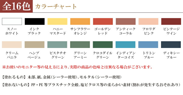 SPEC / 商品情報 容量 450ml カラー 全16色 成分 水、合成樹脂(アクリル)、顔料、ミルクカゼインペプチド 用途 屋内木用 塗装面積 約2.2〜3.1平方メートル(450ml/2回塗り) 乾燥時間 10〜20分(指触乾燥)、1〜2日(完全乾燥) 生産国 日本 特徴 ・森永乳業のミルク原料を使用した天然由来ペイント・アメリカントラッドの色調を忠実に再現・水性で安心・クリーミーな質感で、伸びがよく塗りやすい・マットな仕上がりで、乾燥後は耐水性に